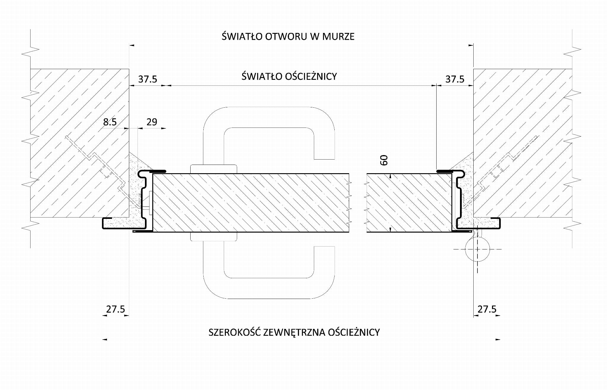 Skrzydło drzwiowe o grubości 60 mm wyposażone jest w dwa homologowane zawiasy, z czego jeden z nich posiada sprężynę z półautomatycznym zamykaniem. Pozwala to na samoczynne domykanie drzwi co sprawia, że zwykle nie zachodzi już konieczność stosowania dodatkowych akcesoriów tj. samozamykacz.